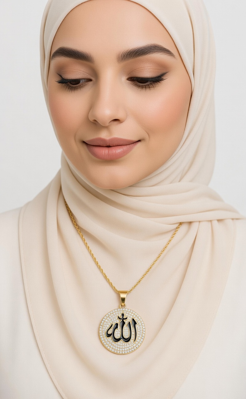 Designed for women who love meaningful fashion, this stunning Allah locket set features a sparkling circular pendant engraved with “Allah” in elegant Arabic calligraphy, surrounded by shimmering stones that catch the light from every angle. Paired with a sleek gold-toned chain, this piece creates a graceful look that feels both modern and spiritual.